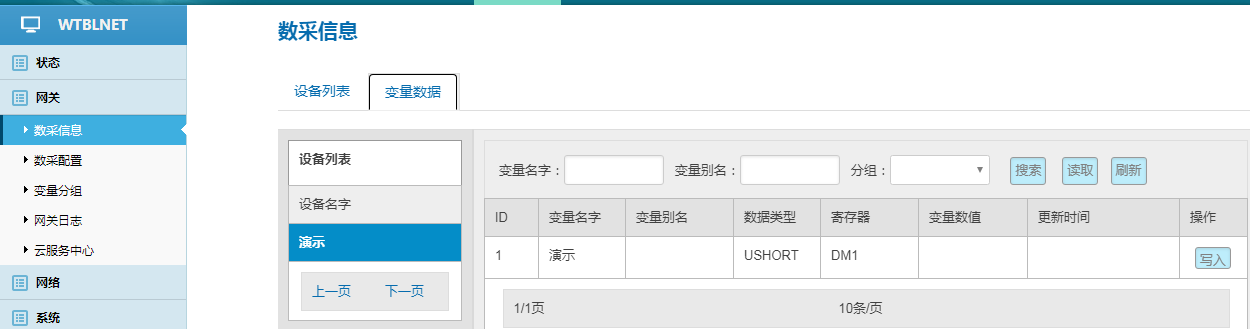 数采配置(设备信息+变量参数)完成后,重启采集程序并生效配置,即可在:数采信息---变量数据---设备名称中看到采集上来的数据。