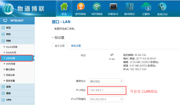 网络---可选WIFI网络、3/4G网络(需要在网关通电前插入手机SIM卡,默认已开启3/4G网络)、WAN外网。