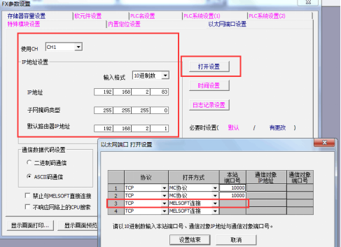 打开MELSOFTGXWorks2,顺利获得编程口登录FX3U控制器,设置FX3U网口参数,点击“参数”——“PLC参数”——“以太网端口设置”,具体设置见下图: