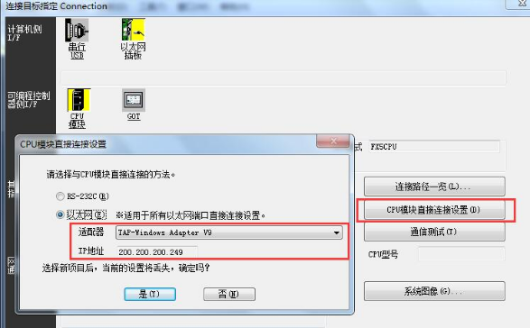 3、CPU模块直连连接设置以太网适配适配器“TAP-WindowsAdapterV9”。