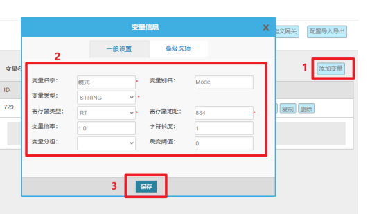 变量配置主要是定义变量名(自定义内容,不可使用中文命名)、变量别名(自定义,可使用中文名字)、寄存器类型和寄存器偏移地址,并定义一些数据规则(如:倍率、小数点、单位、告警)。