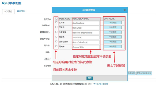 2、配置启用表单,勾选以启用对应表的转发功能,并且可以设置表名称以及表头字段名称