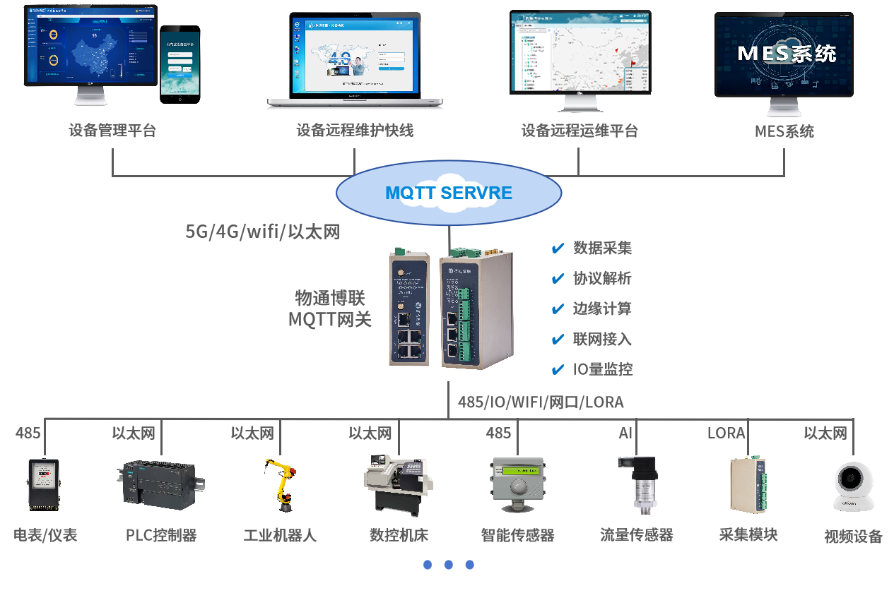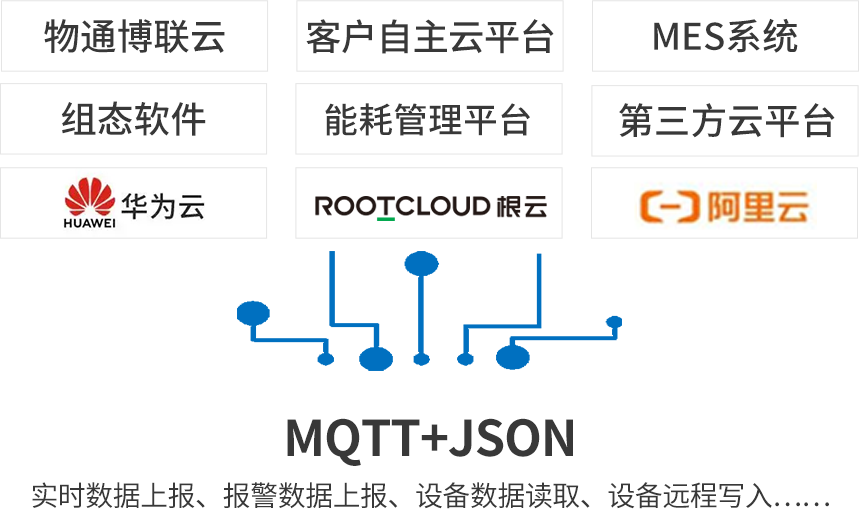 北向支持MQTT协议接入k豆kdpay钱包AI云平台,客户自主开发的云平台,第三方云平台(根云、美云、华为、阿里、百度、微软等IOT云平台),组态软件、MES系统、ERP系统等工业软件