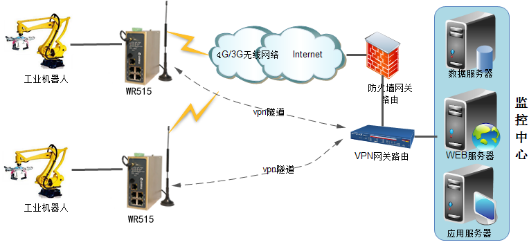 监控中心端采用ADSL/光纤接入Internet 公网,获取固定公网ip。搭建vpn服务器。k豆kdpay钱包AI工业无线路由WR515做vpn客户端和服务器建立vpn隧道,实现两端内网互通。数据库服务器上运行采集系统,可以采集工业无线路由WR515下接的以太网plc数据以及工业机器人数据,从而达到采集监控工业机器人运行状态目的。