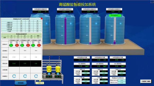 基于云组态功能还原加药工艺流程,快速查询高锰酸钾储液罐、计量泵、配水池等设备状态与工艺参数,一目了然。