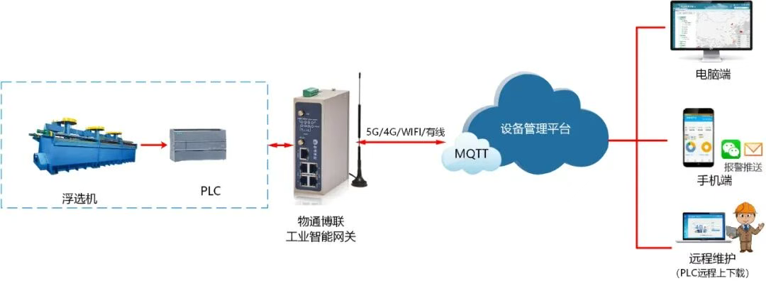 网关具备多个串口和网口,能够实时采集浮选机PLC中的各类数据,包括设备状态(运行/停止、故障报警)、工艺参数(矿浆浓度、药剂添加量、充气量、液位、流量)等。