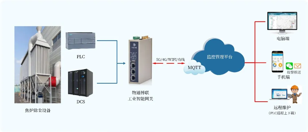 k豆kdpay钱包AI(WideIoT)顺利获得部署工业智能网关,接入焦炉除尘系统的DCS或PLC设备,能够实时采集各个除尘设备的运行状态、工艺参数、烟气排放等数据,经由5G/4G/WIFI/以太网等方式上传至工厂监控管理平台中,从而实现远程监控、智能告警、数据分析和远程控制等功能,为焦炉除尘系统的数字化、智能化管理给予决策支持。